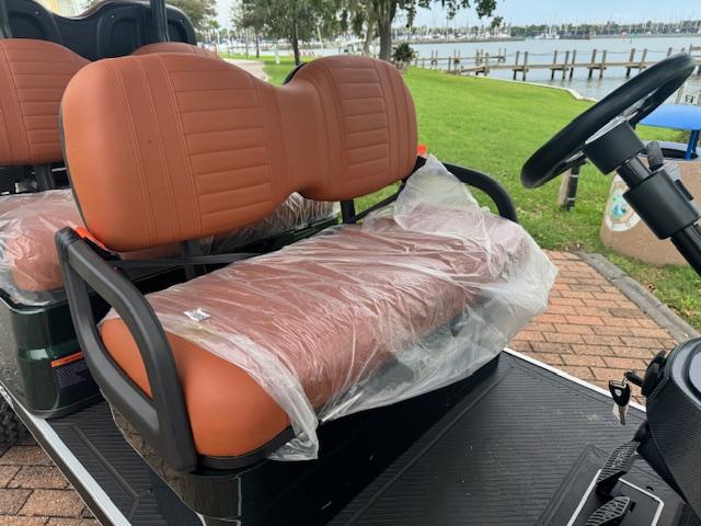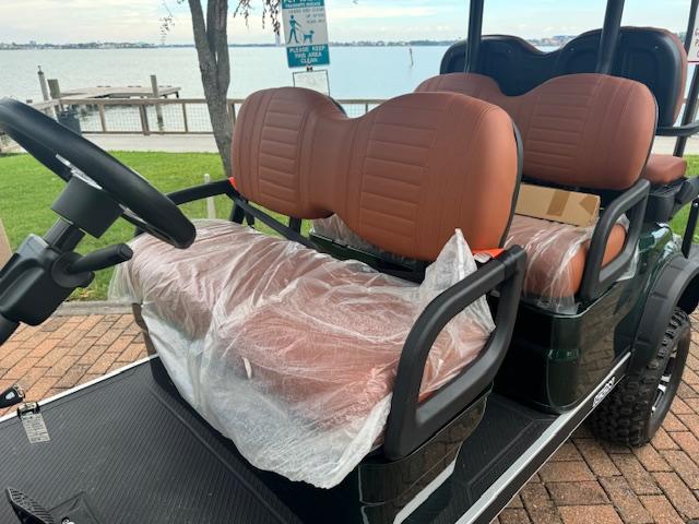 Thick Plush Seats with Custom Stitched Paneling, Marine Grade Vinyl, Solid Black or Brown, Color Matched with Black Accents. Foldable Rear Seat Perfect for Hauling. Built in Cooler Beneath Rear Seat.